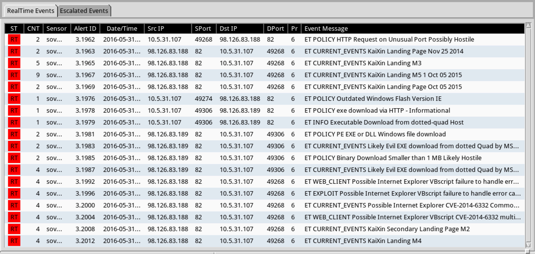 Shown above: Alerts from Sguil in Security Onion using Suricata and the ETPRO ruleset.