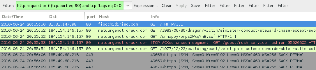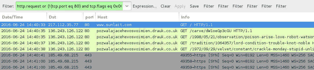 Shown above: Traffic from the first pcap filtered in Wireshark. Filter: http.request or (!(tcp.port eq 80) and tcp.flags eq 0x0002)