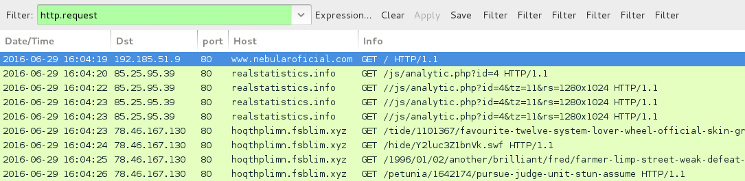 Shown above: Traffic from the fourth pcap filtered in Wireshark (realstatistics gate Neutrino EK sends Gootkit).