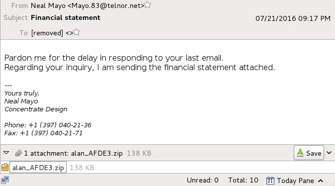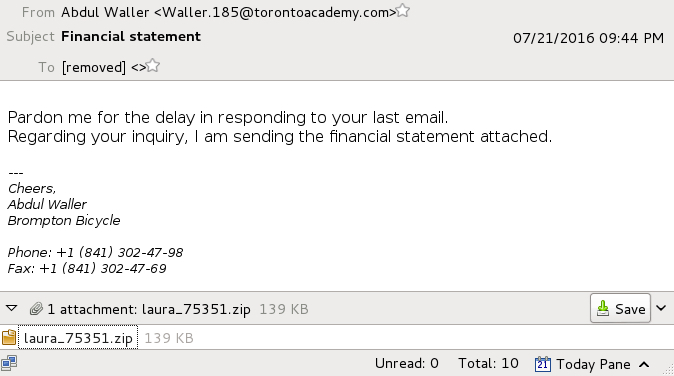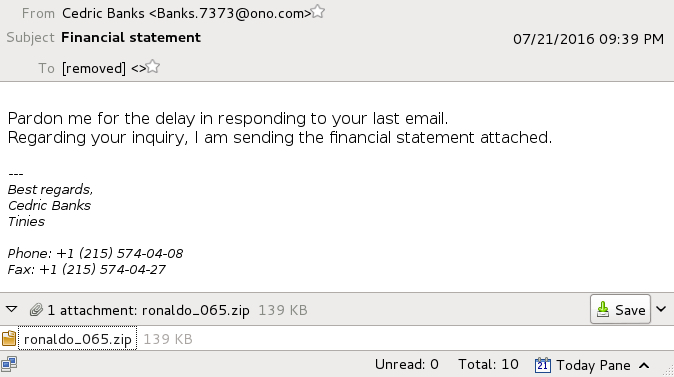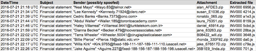 - I grabbed 10 examples of emails in pushing Locky ransomware on Thursday 2016-07-21.
