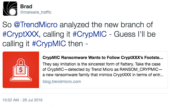 - 2016-07-20 - TrendLabs Security Intelligence Blog - CrypMIC Ransomware Wants to Follow CryptXXX's Footsteps [TrendLabs analyzes the new branch and names it.]