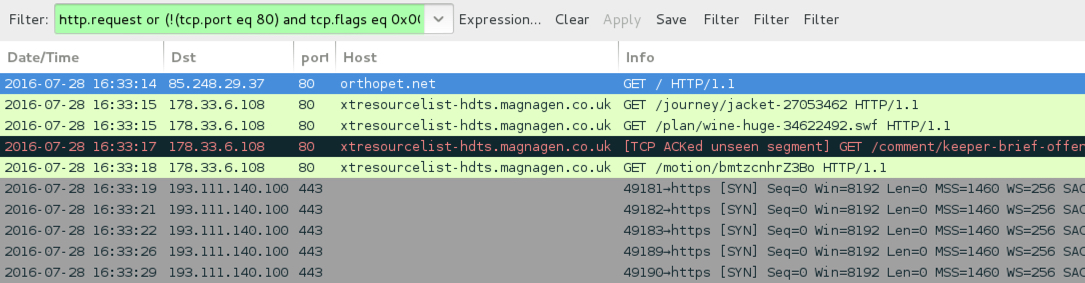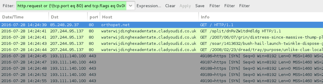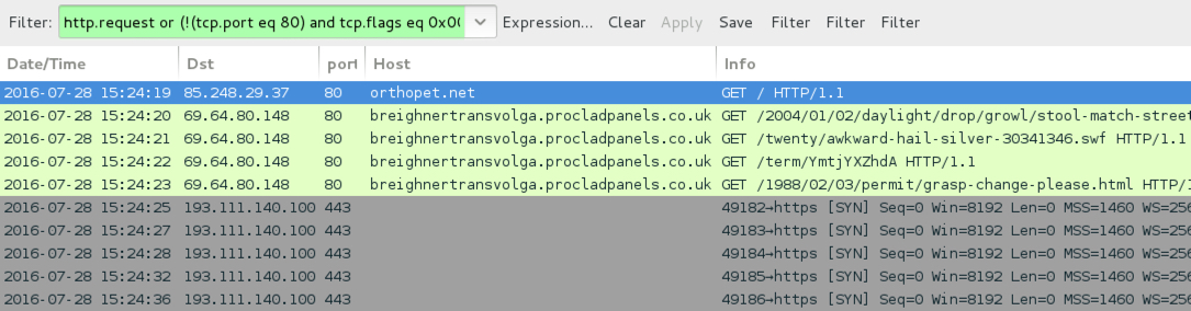 Shown above: Traffic from the first pcap filtered in Wireshark. Wireshark filter: http.request or (!(tcp.port eq 80) and tcp.flags eq 0x0002)