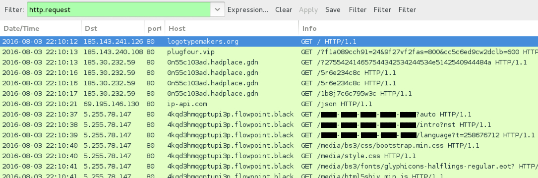 Shown above: Infection traffic from the Threatglass pcap on 2016-08-03 filtered in Wireshark.
