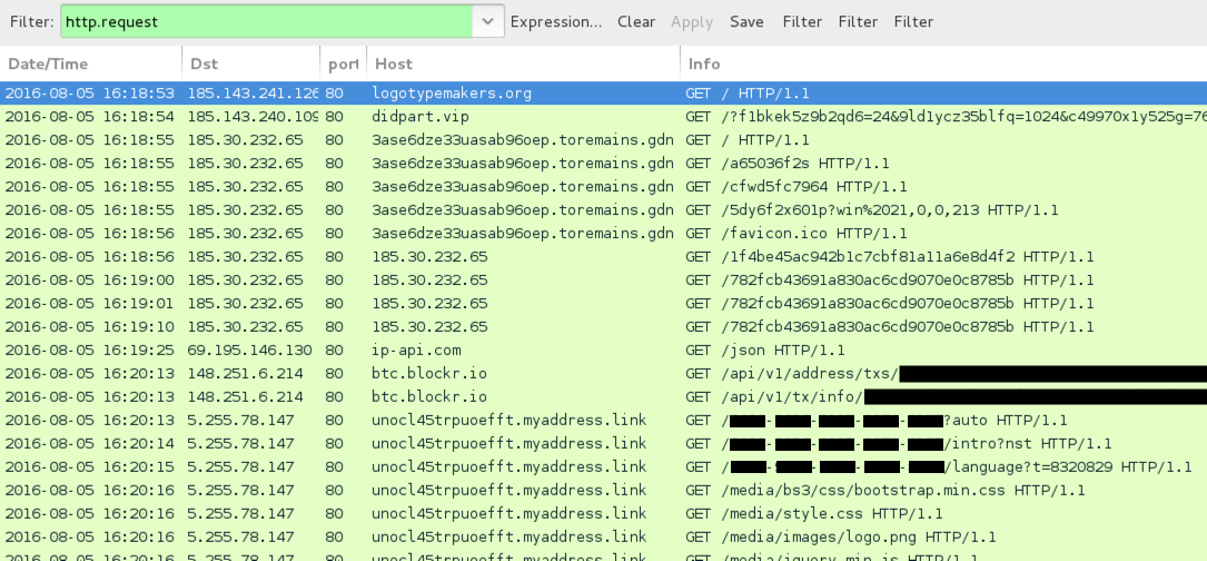 Shown above: Infection traffic from my pcap on 2016-08-05 filtered in Wireshark.