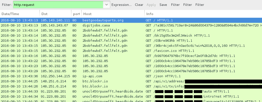 Shown above: Traffic from the infection filtered in Wireshark.