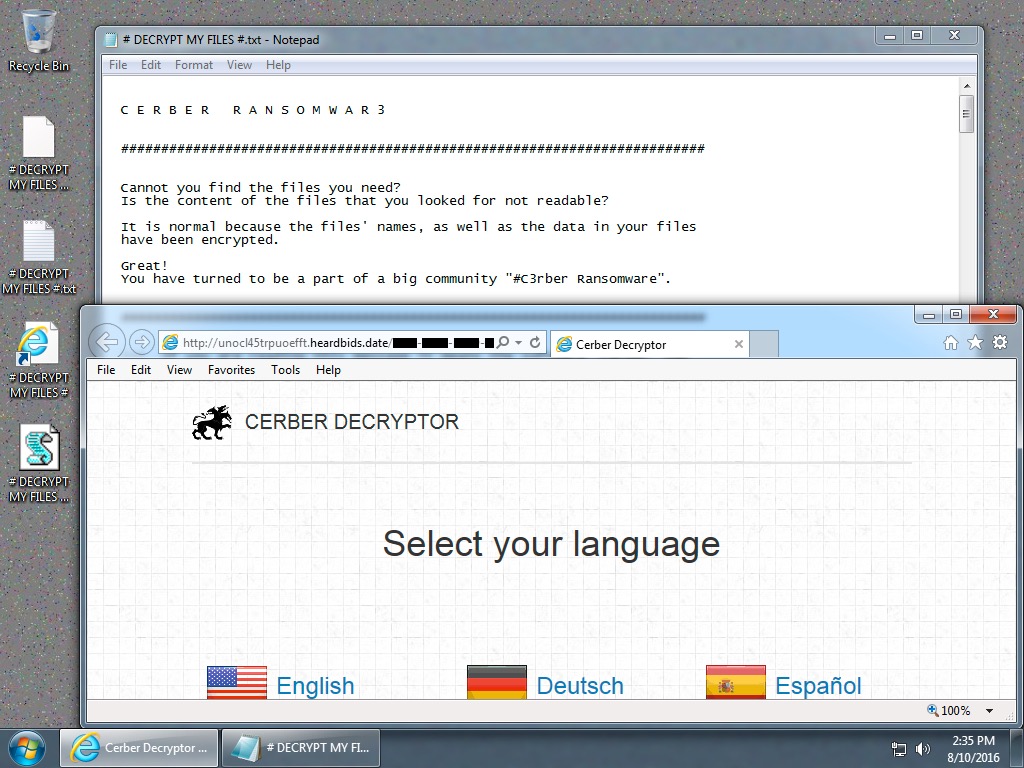 Shown above: Desktop of a Windows host infected with this Cerber ransomware sample.