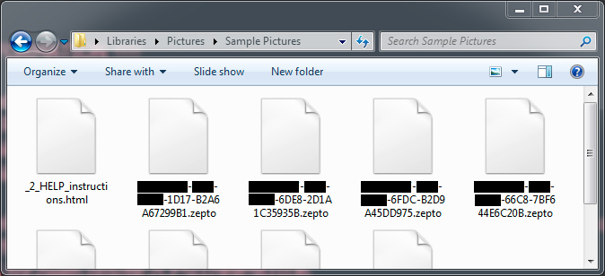 Shown above: Names of the encrypted files showing this is the Zepto variant of Locky ransomware.