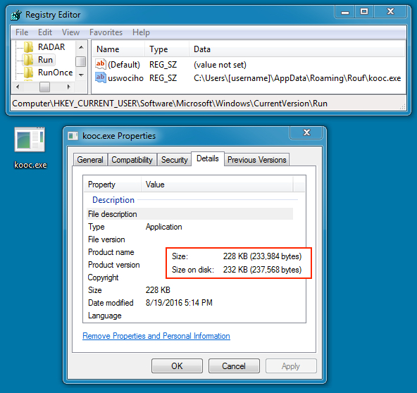 - C:\Users\[username]\AppData\Roaming\Rouf\kooc.exe (same file hash as Rig EK malware payload)