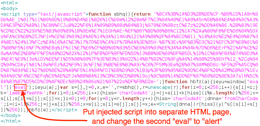 Shown above: Put the script in a separate web page, then change the second "eval" to "alert".