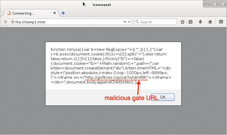 How can you quickly deobfuscate the injected script that led to the gate? Put the script in a separate HTML file (with the proper headers and footers, then change "eval" to "alert" as shown in the images below.