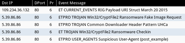 Shown above: EmergingThreats alerts (that I originally ignored) calling this ransomware CryptFile2.