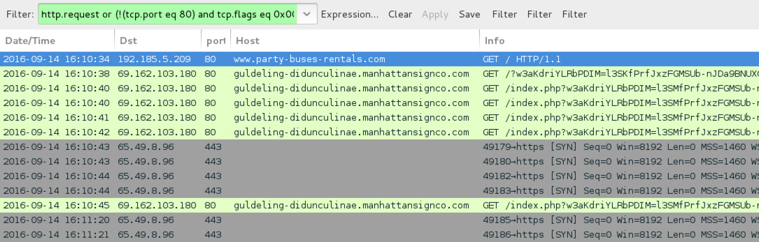 Shown above: Traffic from the first example filtered in Wireshark. Wireshark filter: http.request or (!(tcp.port eq 80) and tcp.flags eq 0x0002)