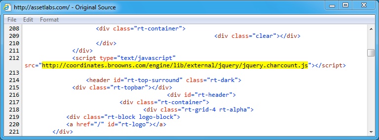 Shown above: Page from the compromised website with injected script leading to the Afraidgate redirect URL.