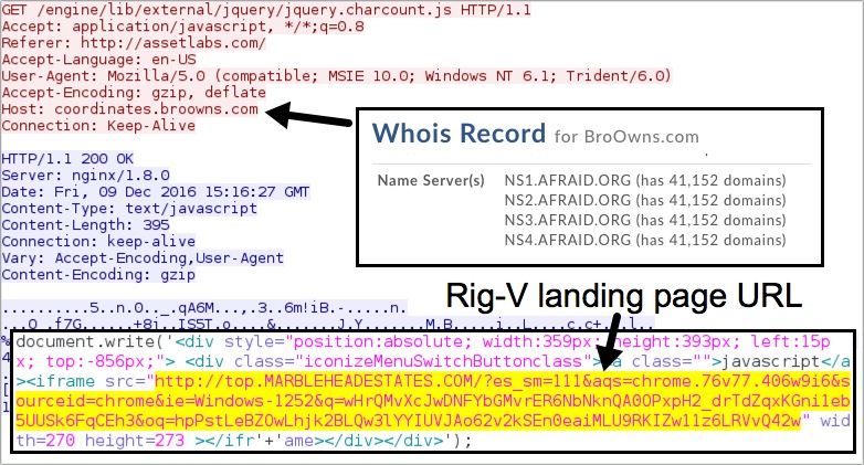 - Rig-V: a "VIP version" with new URL patterns and RC4 encryption for the payload. Used by the Afraidgate, EITest, and pseudoDarkleech campaigns.