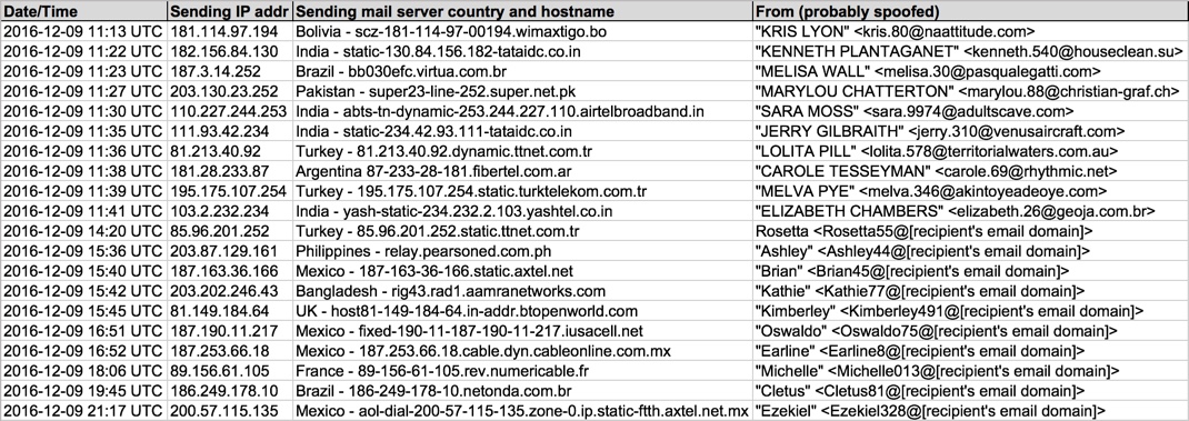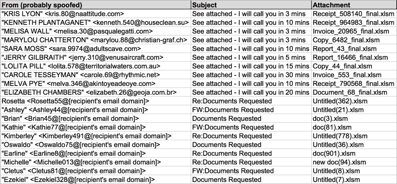 Shown above: Data from 20 emails pushing Locky ransomware (part 1 of 2).