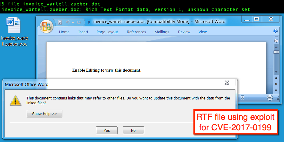 - If a Windows host is still vulnerable, users only need to open the document in an outdated version of Microsoft office to get infected (no macros involved).