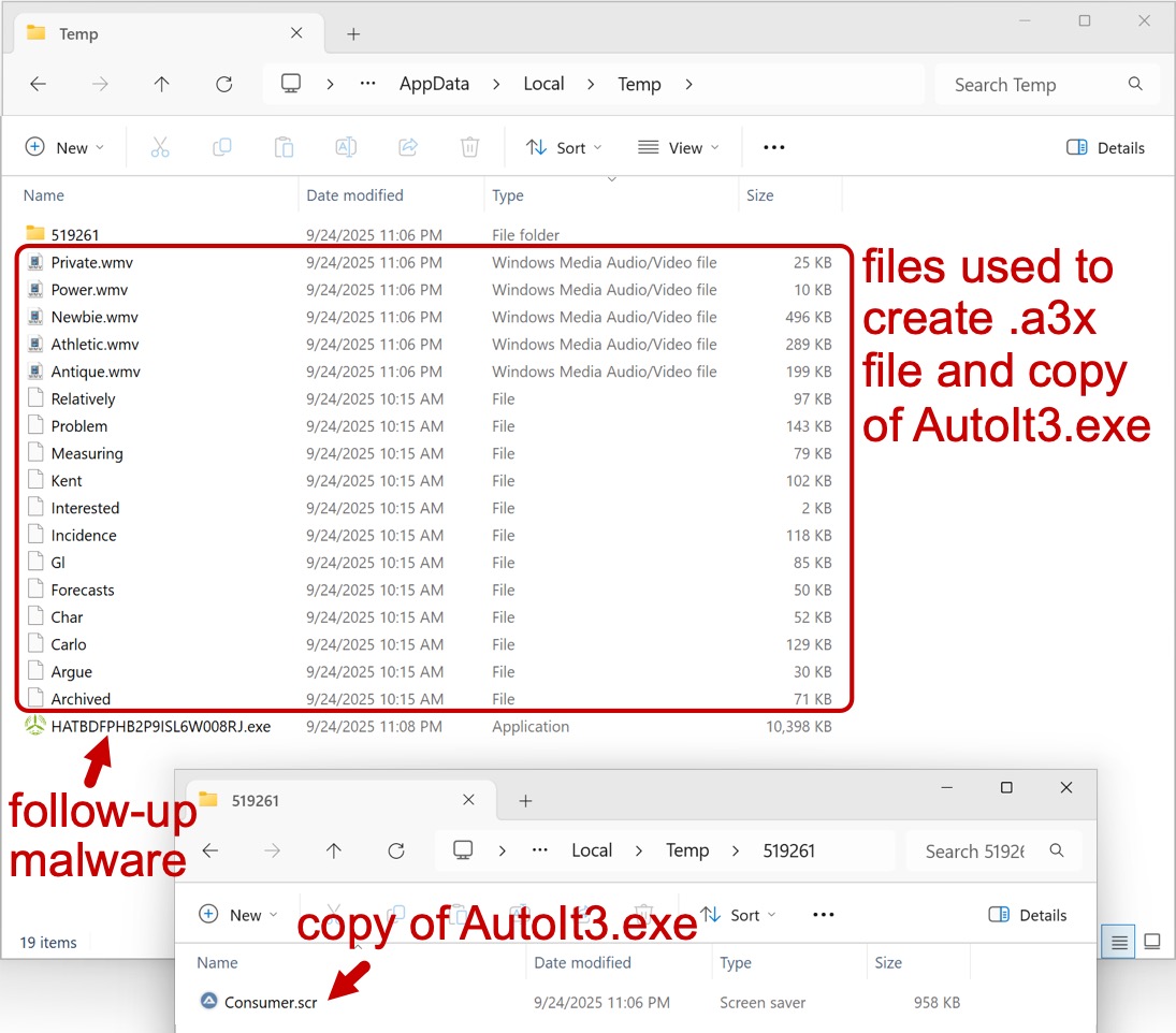 2025-09-24 (WEDNESDAY): LUMMA STEALER INFECTION WITH FOLLOW-UP MALWARE (POSSIBLE GHOSTSOCKS/GO BACKDOOR) NOTES: - This is an example of Lumma Stealer distributed to people searching for cracked software. - This infection chain misuses the AutoIt scripting language to conceal malicious activity. - Obfuscated batch script, a .cab file, and misleading file extensions also help evade detection. PATH TO INITIAL ZIP ARCHIVE DOWNLOAD: - hxxps[:]//www.facebook[.]com/media/set/?set=a.745017525066326&type=3 - hxxps[:]//abbaspcs[.]info/download-link - hxxps[:]//4bind3[.]cfd/direct99?s=11 - hxxps[:]//hitmeup[.]space/?utmPass=igYOMCCz51Iq7MY&date=1758753927&token=QJllKYk&=61 - hxxps[:]//mega[.]nz/file/rEMzUL6R#ghKhnAaeIkBNUBfTwO0i5Wp0KYNPlQGRHogdzwCm-dM DOWNLOADED MALWARE AND EXTRACTED FILSE: - SHA256 hash: 7833707c8c589b667c5450ad4a66dcb63d5b2bbc727e48b120a7c0d6a93ecff3 - File size: 27,840,159 bytes - File name: γ πππππππΈπ γβ€ πππππ β€ π€πππππ β€ πππ.zip - File type: Zip archive data, at least v2.0 to extract, compression method=deflate - File description: downloaded zip archive - SHA256 hash: 787bd213c2065da67b906716e08c6bada8cda63ce468efb7f5c3b2b5747dfe2d - File size: 4,517,837 bytes - File name: β πππππΈππ β ππΌππβ β π½πππ β βπΌπ.7z - File type: 7-zip archive data, version 0.4 - File description: One of the files extracted form the above zip archive, a password-protected 7-Zip archive - Password: 2025 - SHA256 hash: 706a49b55ba73d1294bdad8570017230a5c66a0e5d171d6ad20830226c096c50 - File size: 1,142,333 bytes - File name: Setup.exe - File type: PE32 executable (GUI) Intel 80386, for MS Windows - File description: One of the files extracted form the above 7-Zip archive, an EXE for Lumma Stealer LIST OF FILES FROM AN INFECTION: - C:\Users\[username]\AppData\Local\Temp\Antique.wmv - C:\Users\[username]\AppData\Local\Temp\Athletic.wmv - C:\Users\[username]\AppData\Local\Temp\Newbie.wmv - C:\Users\[username]\AppData\Local\Temp\Power.wmv - C:\Users\[username]\AppData\Local\Temp\Private.wmv - C:\Users\[username]\AppData\Local\Temp\Archived - C:\Users\[username]\AppData\Local\Temp\Argue - C:\Users\[username]\AppData\Local\Temp\Carlo - C:\Users\[username]\AppData\Local\Temp\Char - C:\Users\[username]\AppData\Local\Temp\Forecasts - C:\Users\[username]\AppData\Local\Temp\Gl - C:\Users\[username]\AppData\Local\Temp\Incidence - C:\Users\[username]\AppData\Local\Temp\Interested - C:\Users\[username]\AppData\Local\Temp\Kent - C:\Users\[username]\AppData\Local\Temp\Measuring - C:\Users\[username]\AppData\Local\Temp\Problem - C:\Users\[username]\AppData\Local\Temp\Relatively - C:\Users\[username]\AppData\Local\Temp\519261\Consumer.scr - C:\Users\[username]\AppData\Local\Temp\HATBDFPHB2P9ISL6W008RJ.exe FILES FROM AN INFECTION: - SHA256 hash: f01f40dfefb50202d4e83fe14d3dc9ec5eec1f5480702e8783462dfc2bfaa9e8 - File size: 9,953 bytes - File location: C:\Users\[username]\AppData\Local\Temp\Power.wmv - File type: ASCII text, with very long lines (433), with CRLF line terminators - File description: Obfuscated script to create copy of AutoIt3.exe and .a3x file for Lumma Stealer - SHA256 hash: 65194fff5b442e5b04473606feb4a2d9e00582028e4a3c60c4c3bafd2c815698 - File size: 507,824 bytes - File location: C:\Users\[username]\AppData\Local\Temp\Newbie.wmv - File type: data - File description: .cab file with content used to create copy of AutoIt3.exe - SHA256 hash: 3ec9740bedc683021cc3e94e4a33b3a9d3d6f9b9e96b1f04cc6534f551dd58c1 - File size: 980,064 bytes - File location: C:\Users\[username]\AppData\Local\Temp\519261\Consumer.scr - File type: PE32 executable (GUI) Intel 80386, for MS Windows - File description: Copy of AutoIt3.exe created from above .cab file content - SHA256 hash: 323eeece9d4bc731917865e36c47ece6d21a74f79bdc67b11a51eb3339c6ae7a - File size: 524,409 bytes - File type: data - File description: .a3x file for Lumma Stealer created by the installer - Sandbox analysis: https://app.any.run/tasks/2315f695-ab53-482e-94a6-9a24fd50f682 - SHA256 hash: f9716135b3eb5b91e697cb02fda30a5c1d0de0867382d9f5b99ac576d9bacf48 - File size: 10,647,040 bytes - File type: PE32 executable (GUI) Intel 80386, for MS Windows - File location: hxxp://86.54.24[.]25/Renewable.exe - File location: C:\Users\[username]\AppData\Local\Temp\HATBDFPHB2P9ISL6W008RJ.exe - File description: Follow-up malware from the infection, possible GhostSocks/Go Backdoor LUMMA STEALER C2 TRFFIC: - 164.90.129[.]126:443 - fixatmu[.]pics - HTTPS traffic (TLSv1.3) C2 TRAFFIC FROM THE FOLLOW-UP MALWARE: - 91.212.166[.]19:443 - HTTPS traffic (TLSv1.3) - 91.84.106[.]132:22789 - HTTPS traffic (TLSv1.3)