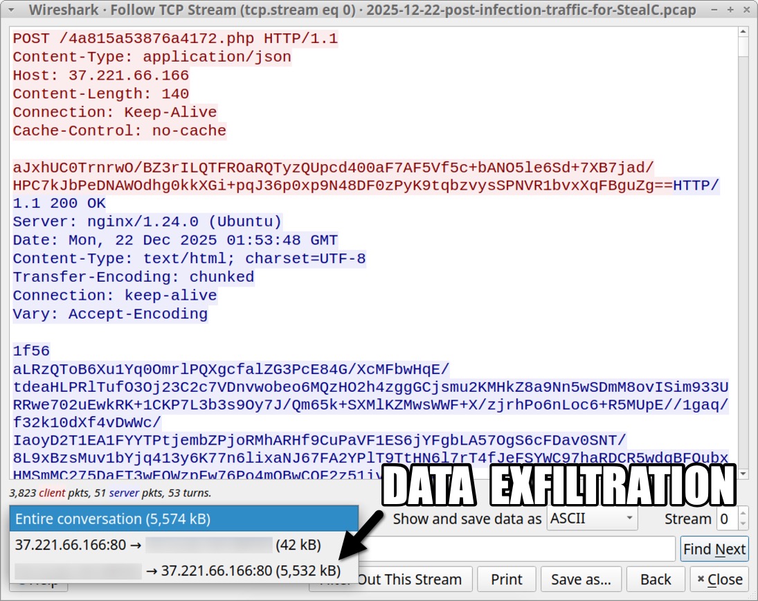 Shown above: TCP stream of the StealC traffic.