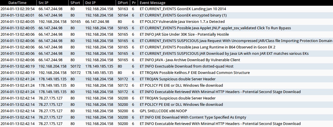 - 02:39:54 UTC - 66.147.244[.]98:80 - ET CURRENT_EVENTS GoonEK Landing Jan 10 2014