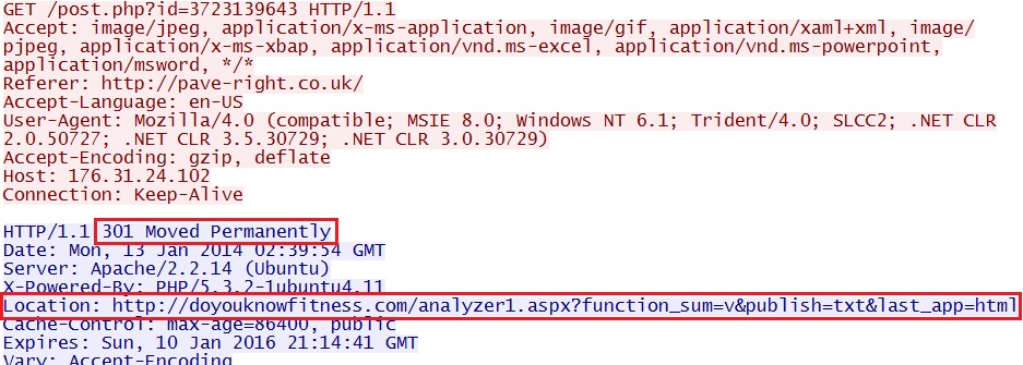 - 20:39:55 CST - 66.147.244[.]98:80 - doyouknowfitness[.]com - GET /analyzer1.aspx?function_sum=v&publish=txt&last_app=html