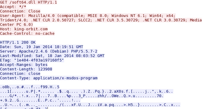 - 18:19:30 UTC - 109.163.239[.]226 port 80 - king-orbit[.]com - GET /soft64.dll