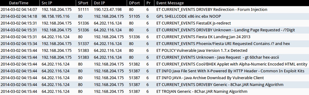 - 2014-03-02 04:15:31 UTC - 64.202.116[.]124:80 - ET CURRENT_EVENTS Fiesta EK Landing Jan 24 2013