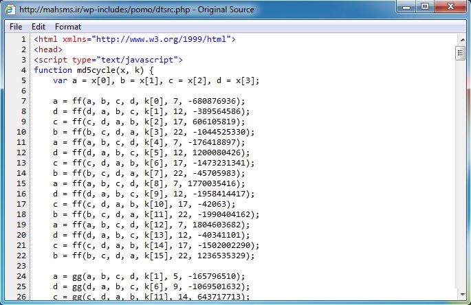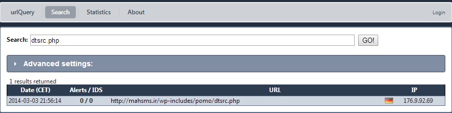 - 02:35:53 UTC - 176.9.92[.]69:80 - mahsms[.]ir - GET /wp-includes/pomo/dtsrc.php?a=h1&f=76f8783379f1a766117d46a45ca298e1