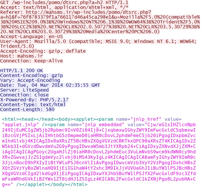 - 2014-03-04 02:35:56 UTC - 176.9.92[.]69:80 - ET CURRENT_EVENTS Possible Java Applet JNLP applet_ssv_validated in Base64 3