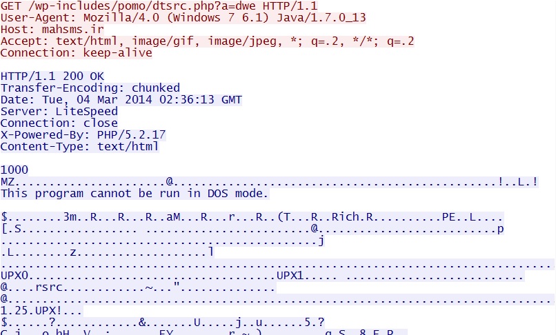Java exploit CVE-2013-2465 delivers EXE payload - mahsms[.]ir/wp-includes/pomo/dtsrc.php?a=dwe