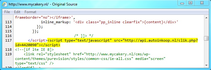 Embedded javascript from the infected web page - www.mycakery[.]nl/