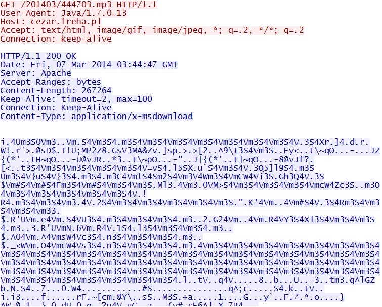 Java exploit delivers EXE payload - cezar.freha[.]pl/201403/444703.mp3