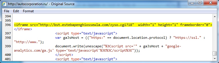 Embedded iframe in page from compromised website - autocorporation[.]ru/
