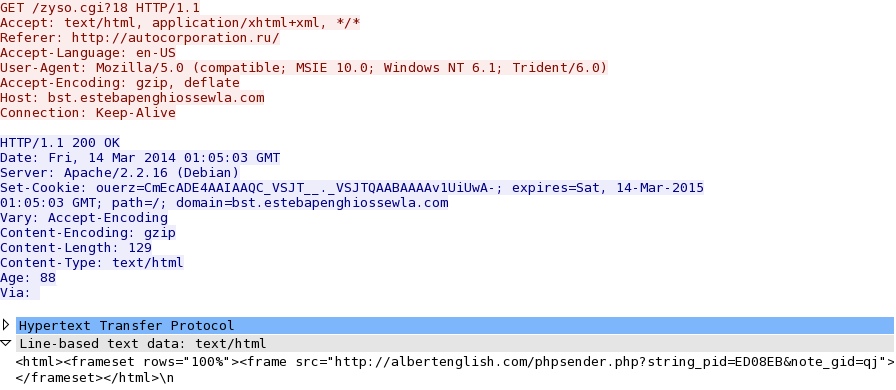 - 01:06:40 UTC - 173.254.28[.]52:80 - albertenglish[.]com - GET /03/14/2014/03/13/2014/768087.mp3