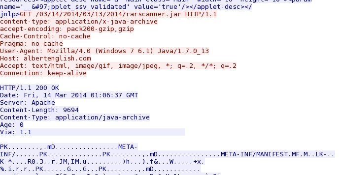 - 01:06:37 UTC - 173.254.28[.]52:80 - albertenglish[.]com - GET /03/14/2014/03/13/2014/rarscanner.jar