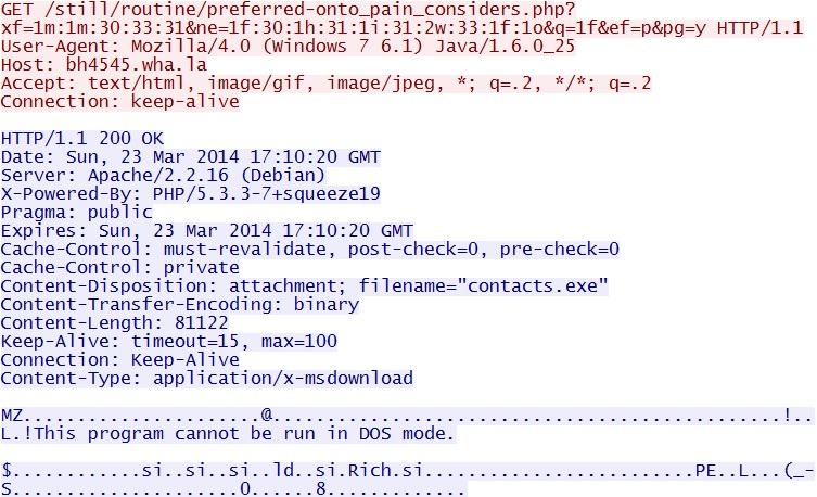 - 2014-03-23 17:07:59 UTC - 198.50.171[.]44:80 - ET CURRENT_EVENTS DRIVEBY Blackhole - Payload Download - contacts.exe
