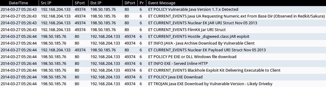 - 2014-03-27 05:26:43 UTC - 198.50.185[.]76:80 - ET CURRENT_EVENTS Nuclear EK JAR URI Struct Nov 05 2013