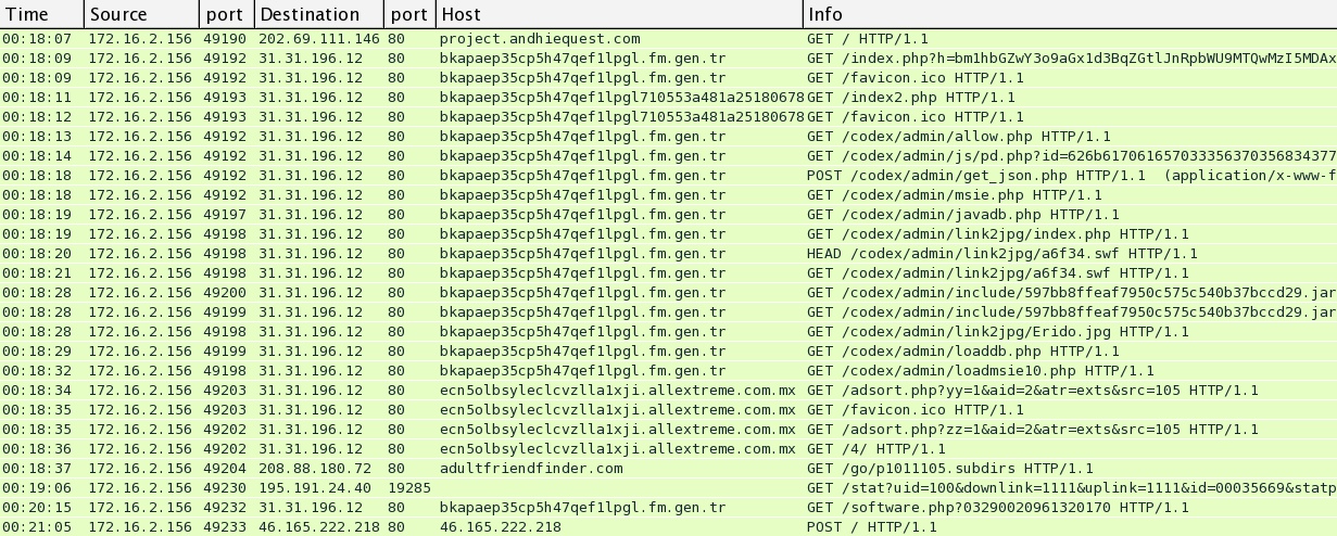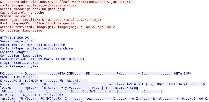 - 19:18:29 UTC - bkapaep35cp5h47qef1lpgl.fm.gen[.]tr - GET /codex/admin/loaddb.php [malware payload from Java exploit]