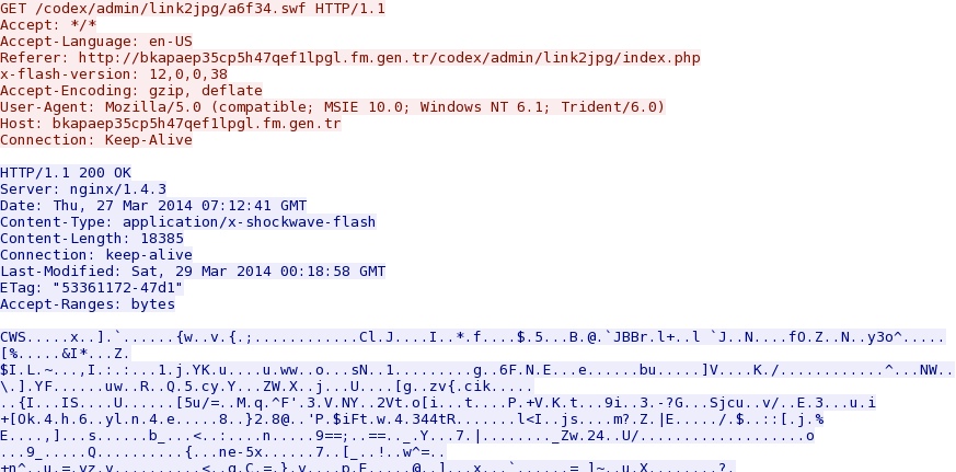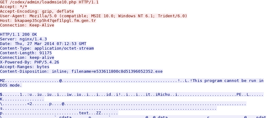 - 19:18:32 UTC - bkapaep35cp5h47qef1lpgl.fm.gen[.]tr - GET /codex/admin/loadmsie10.php [same malware payload from CVE-2014-0322]