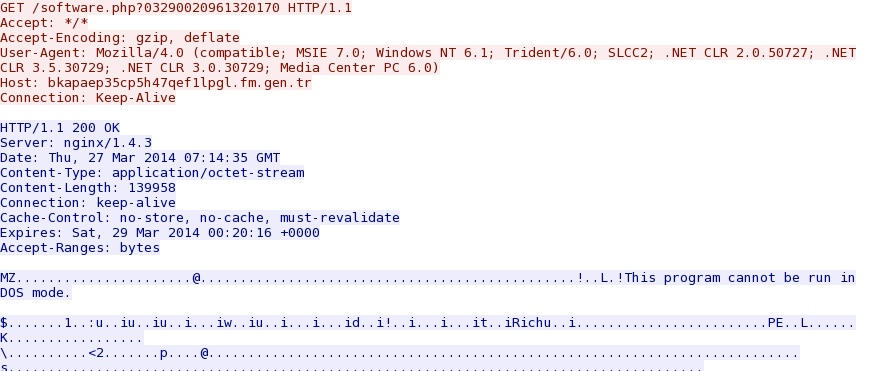 60-4571-a15a-4cda85d1e373&comment=20140325&p=0&s= HTTP/1.0 - 19:20:15 UTC - bkapaep35cp5h47qef1lpgl.fm.gen[.]tr - GET /software.php?03290020961320170 [returns another EXE file]