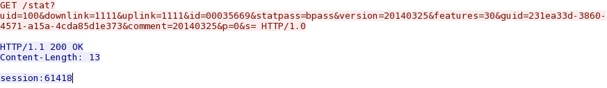 - 19:19:06 UTC - 195.191.24[.]40:19285 - GET /stat?uid=100&downlink=1111&uplink=1111&id=00035669&statpass=bpass&version=20140325&features=30&guid=231ea33d-38