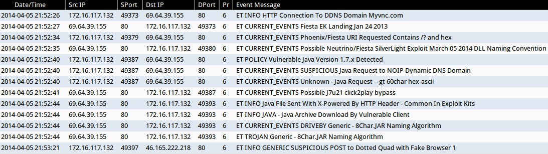 - 2014-04-05 21:52:44 UTC - 69.64.39[.]155:80 - ET CURRENT_EVENTS DRIVEBY Generic - 8Char.JAR Naming Algorithm