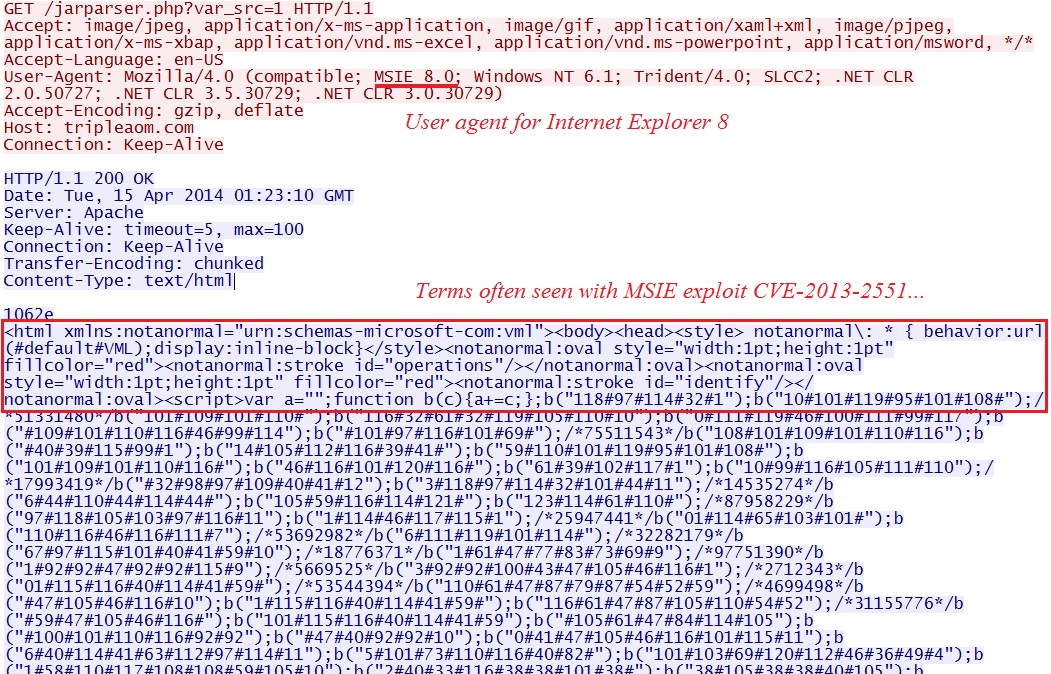 Along with a Silverlight exploit, this one sent a Flash file. The first HTTP GET request to the EK returns what looks like a CVE-2013-2551 MSIE exploit.