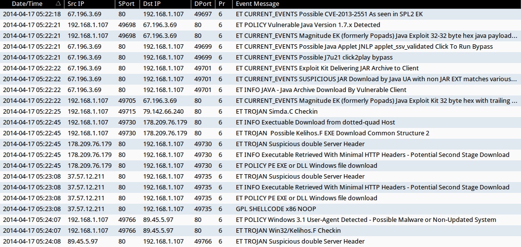 - 2014-04-17 05:22:21 UTC - 67.196.3[.]69:80 - ET CURRENT_EVENTS Magnitude EK (formerly Popads) Java Exploit 32-32 byte hex java payload request Oct 16 2013