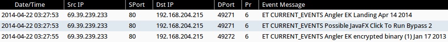 - 2014-04-22 03:27:53 UTC - 69.39.239[.]233:80 - ET CURRENT_EVENTS Possible JavaFX Click To Run Bypass 2