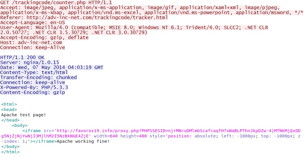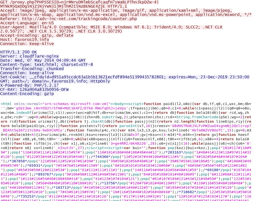 - I originally thought this was Goon/Infinity EK, but this was identified as RIG Exploit Pack by Kahu Security: https://web.archive.org/web/20140516025001/http://www.kahusecurity.com/2014/rig-exploit-pack/
